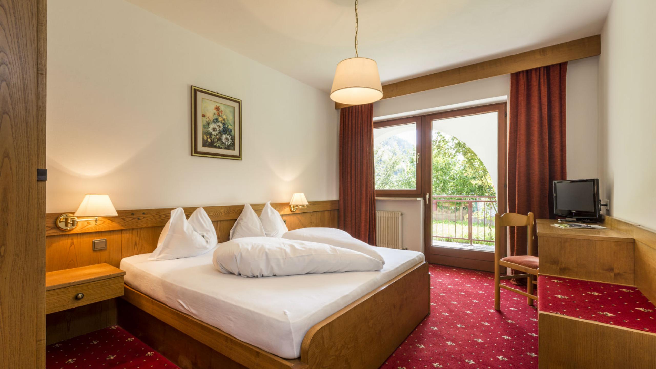 Double room with balcony facing west or direct access to the garden. Furnished in typical Tyrolean style, desk, luggage deposit, shower/WC with hairdryer, flat-screen TV with satellite receiver, telephone and room safe.